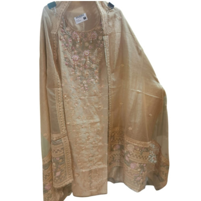 Elegant Cream Organza Floral Embroidered Suit Set with Plain Bottom 🪡 Fabric Details: To..