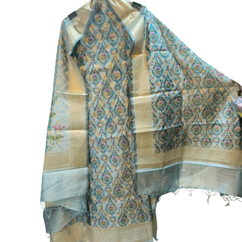 Fabric (Top/Kameez): Banarasi Brocade Silk / Semi-Silk (Features an intricate, all-over metallic weave).