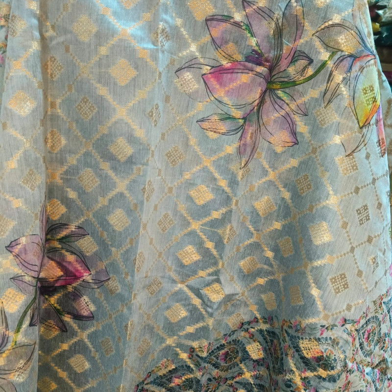 Dupatta: Banarasi Jaal with Meenakari Work (The characteristic multi-color floral weaving—like pink, green, and red motifs—interspersed within the gold zari pattern).