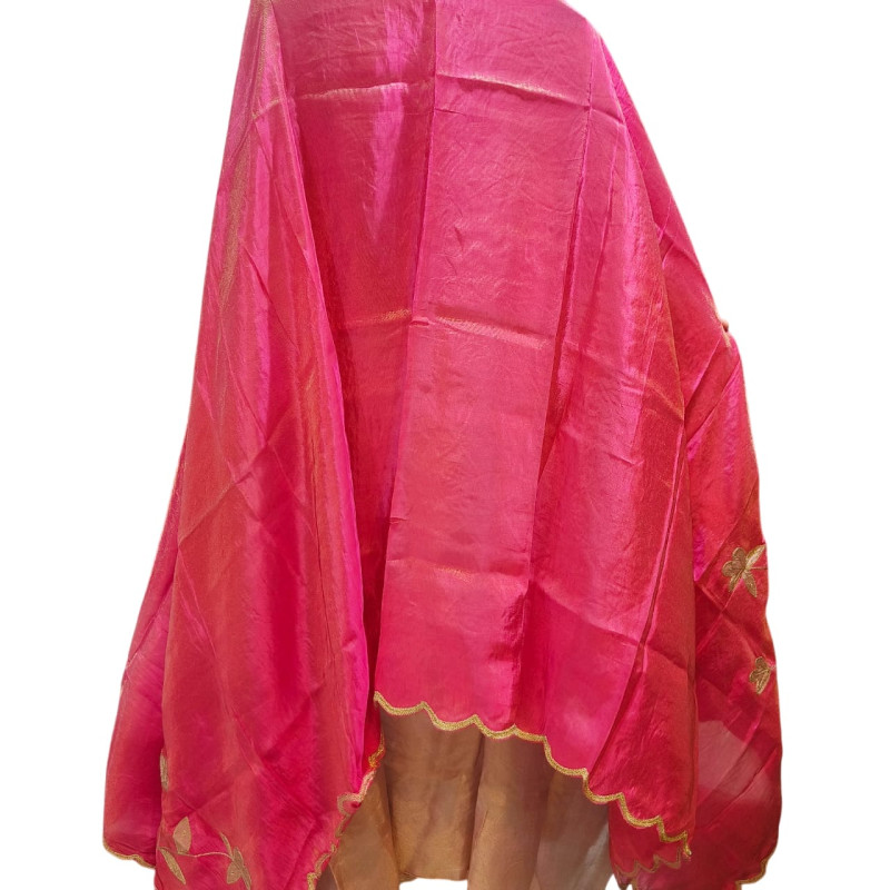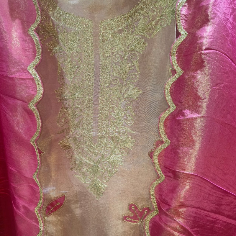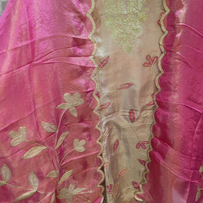 Bring a touch of grandeur to your next event with this stunning suit set. The kurta is crafted from lustrous Rose Gold Tissue Silk and features delicate gold Zari embroidery on the yoke and scattered leaf motifs. It is paired with a Plain matching or complementary bottom fabric. The highlight is the gorgeous Rani Pink Tissue Dupatta that boasts a shiny, textured finish, heavy gold Zari leaf embroidery, and beautiful scalloped edging. Perfect for festivals, weddings, and formal gatherings.