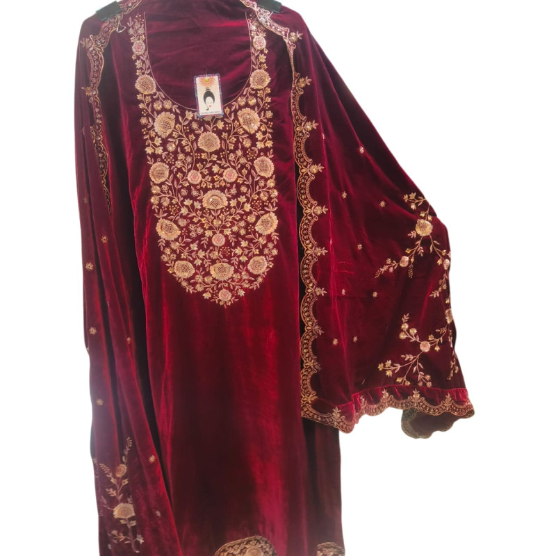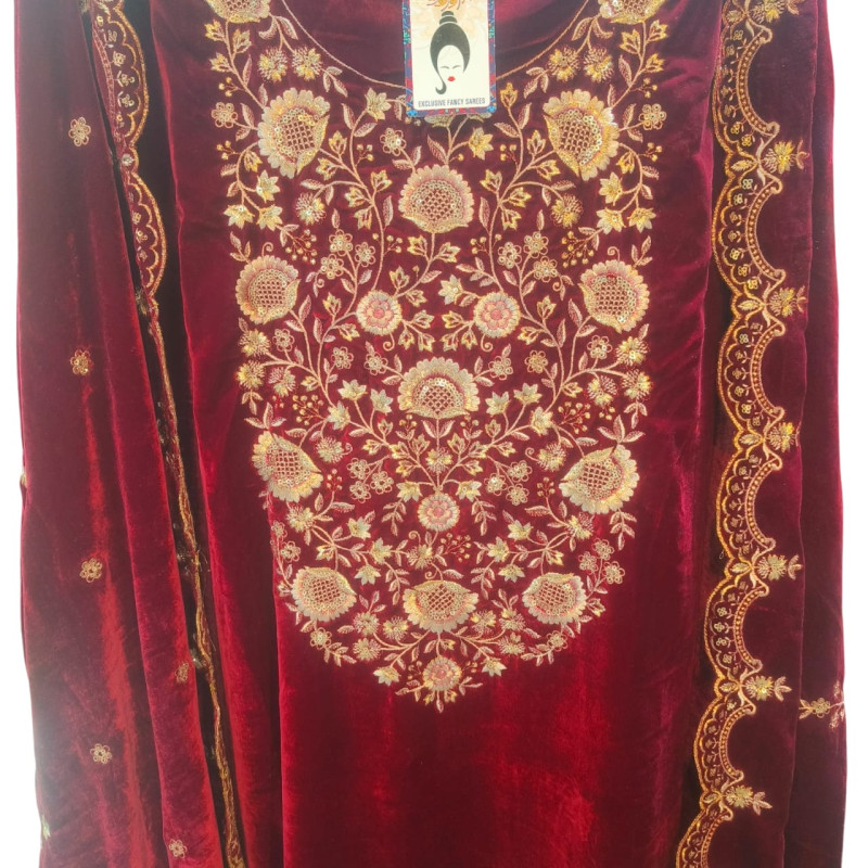 Product Name: "Heavily Embroidered Velvet Suit Set" or "Regal Maroon Tilla/Zari Work Velvet Ensemble"