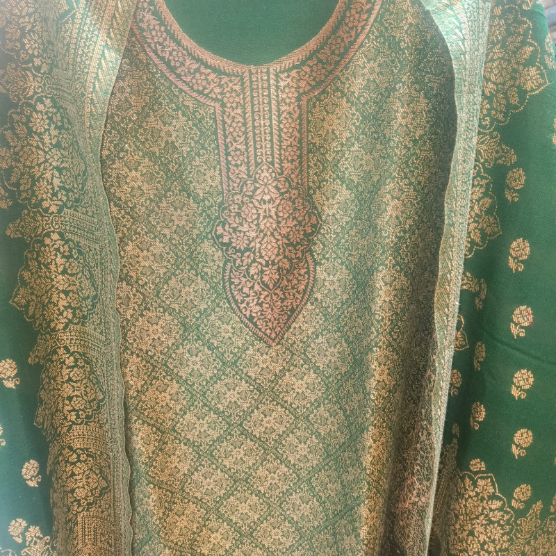 Color: Rich emerald green with intricate golden woven motifs and detailed neckline design