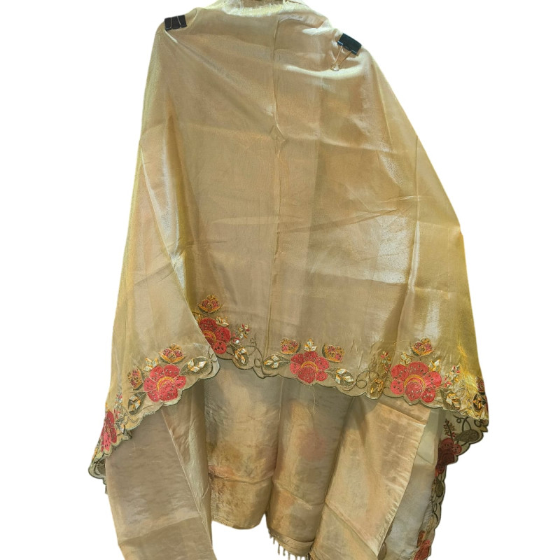 Fabric (Top): Premium glass tissue fabric with elegant shine and intricate embroidery on the neckline