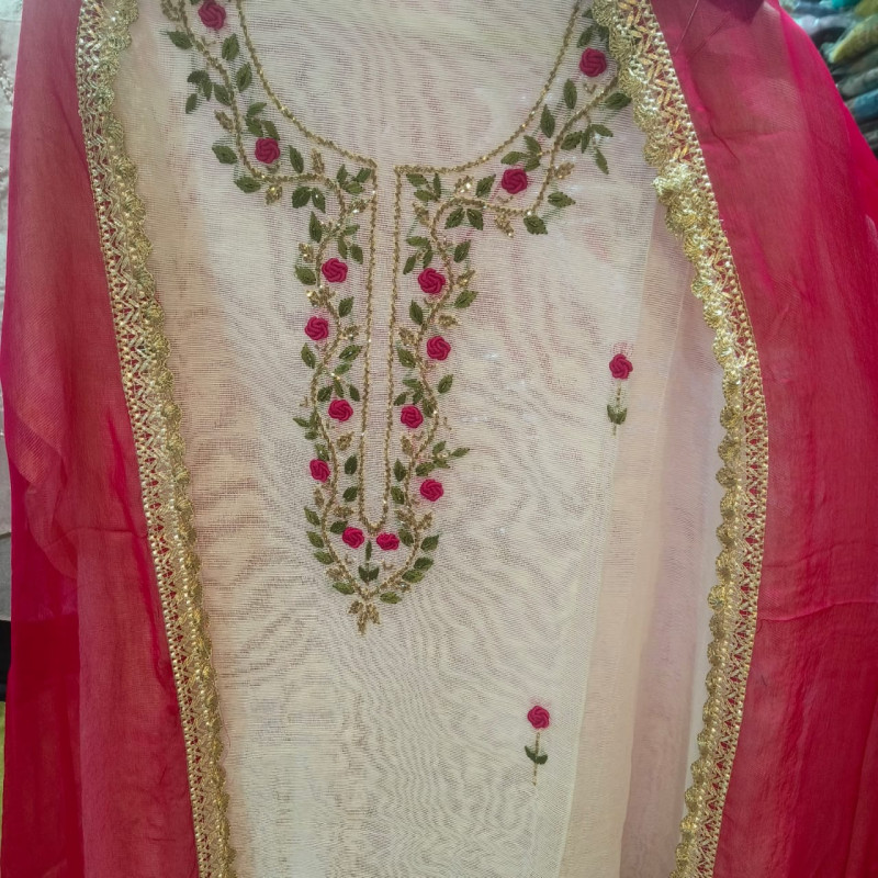 Color Description: Off-White/Cream top with Pink (Rani Pink/Fuchsia) and Green embroidery, contrasted with a Rani Pink/Deep Magenta dupatta.