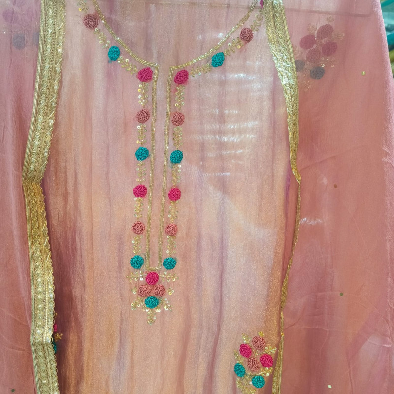 • Product Name Suggestion: Rose Gold Tissue Embroidered Suit Set • Fabric: Glass Tissue • Colour: ..