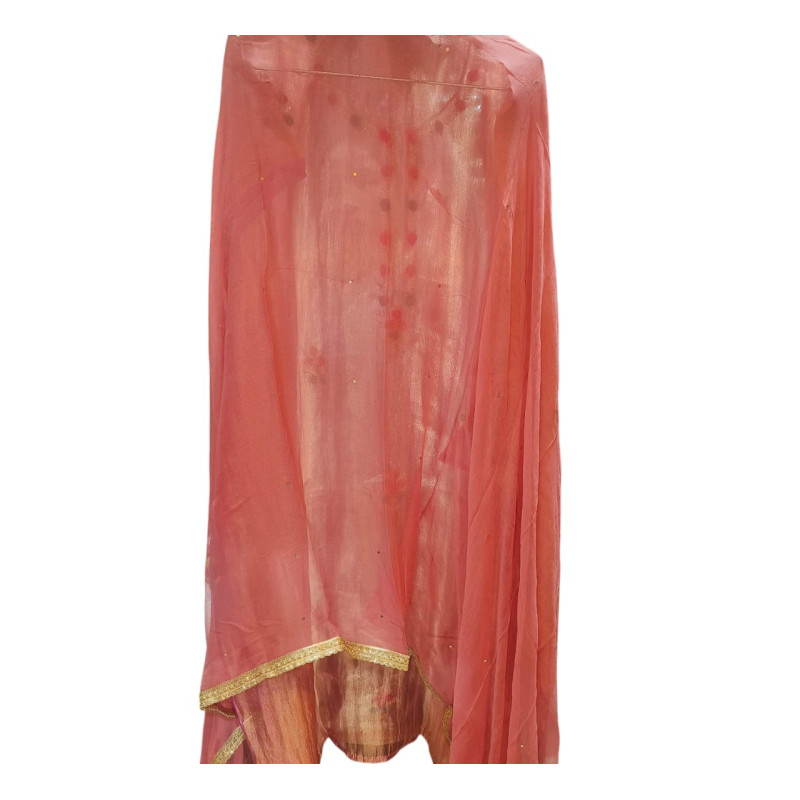 This exquisite ethnic ensemble features a delicate Glass Tissue Kurta (top) in a beautiful Peach/Coral hue. The Glass Tissue fabric offers a unique, shimmery texture and a light, airy feel that makes it perfect for festive and semi-formal occasions.