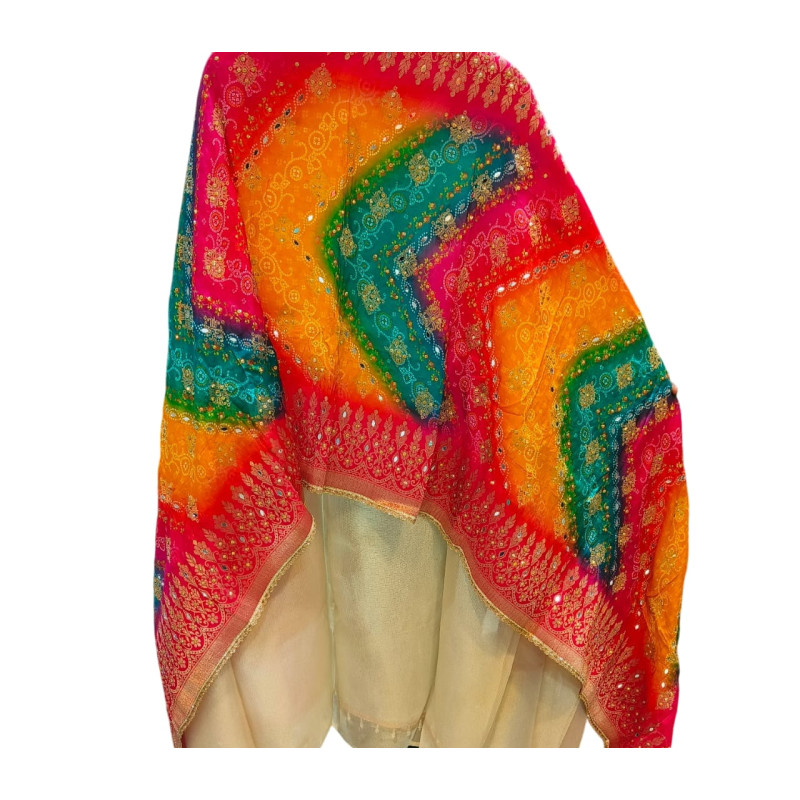 Dupatta: Contrast (Multi-colored/Rainbow Bandhani style with embellishment/mirror-work border)