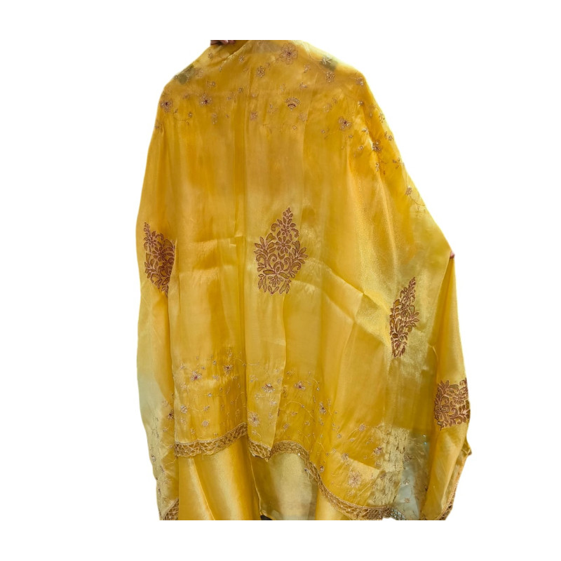 Dupatta Fabric: Glass Tissue (Appears to have a sheen and intricate embroidery work)