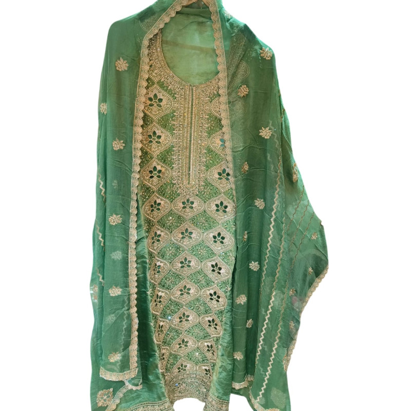 Work/Embroidery: The outfit features heavy Zari, thread, and mirror work embroidery in intricate floral and geometric patterns, giving it a rich and traditional appeal.