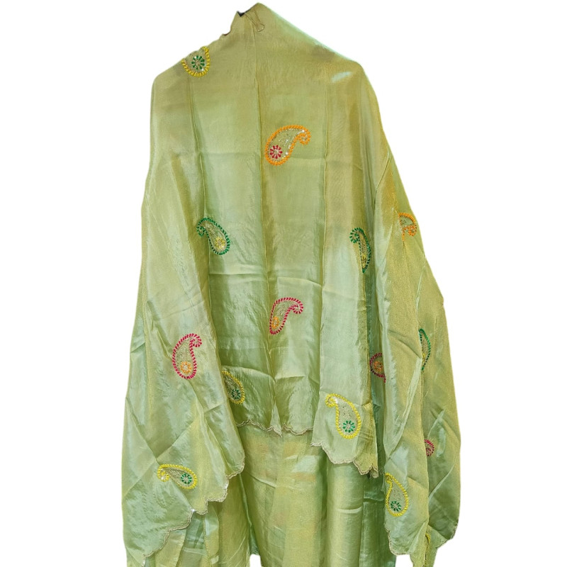 Fabric (Top & Dupatta): Shimmer fabric, giving it a subtle sheen and luxurious drape.