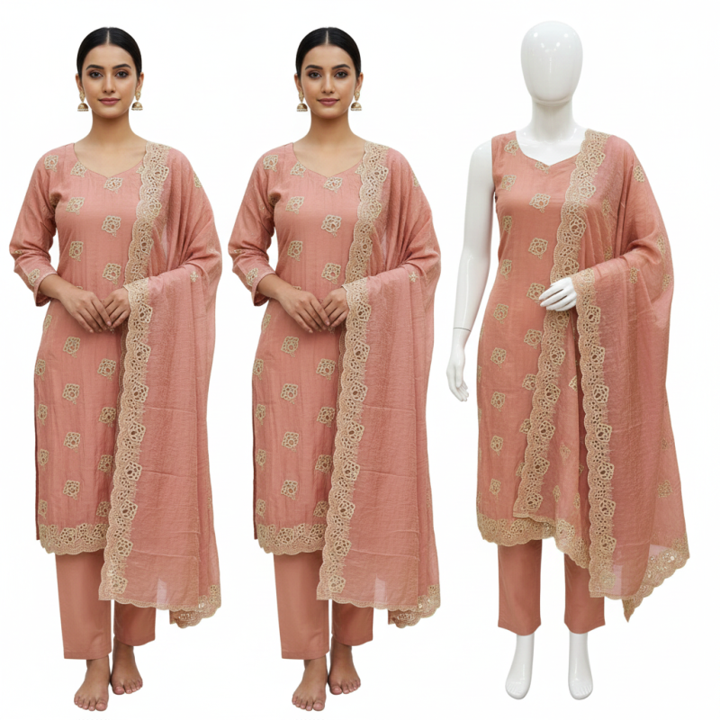 Bottom: Plain Crape fabric is used for the bottom (straight-cut pants/salwar) in a matching peach shade.