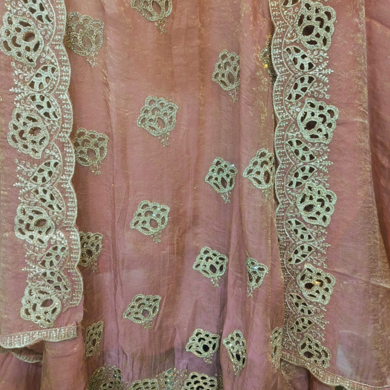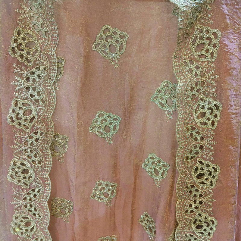 Dupatta: The matching dupatta features heavy golden cutwork along all borders, creating a striking, elaborate edge. Scattered motifs may also be present across the dupatta.