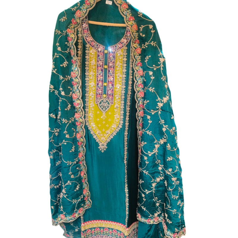 Colour Description: The suit is a rich Teal or Peacock Green color. The central panel/yoke is a bright contrast of Mustard Yellow/Lime Green, with detailing in pink, yellow, and green embroidery.
