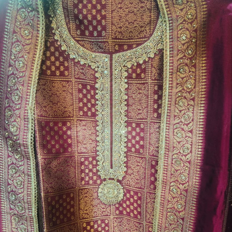 Colour & Fabric: The dominant colour is a rich, deep Maroon or Wine Red. The Kameez (suit) fabri..