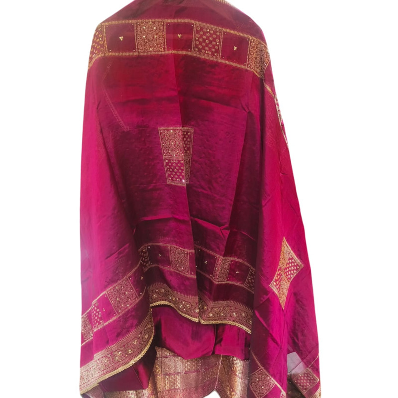Colour Description: A beautiful, deep Maroon or Wine Red color, accented with traditional Gold Zari weaving throughout.
