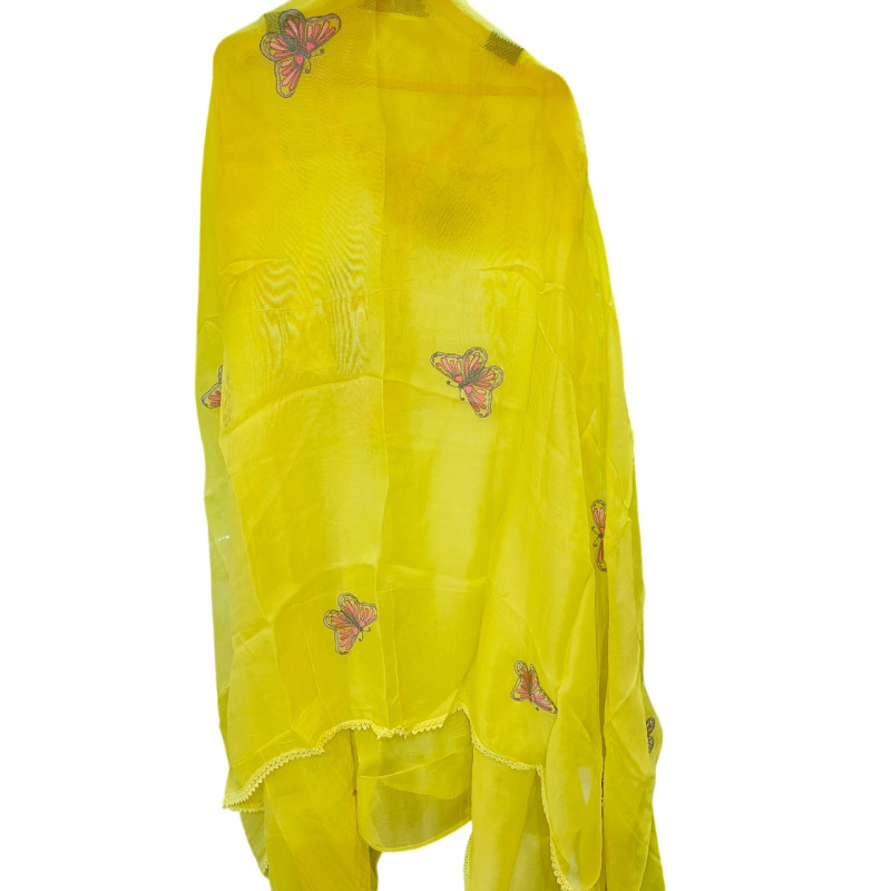 Fabric (Suit): Crape. The suit is a vibrant, solid bright yellow or mustard color. The neck area fea..