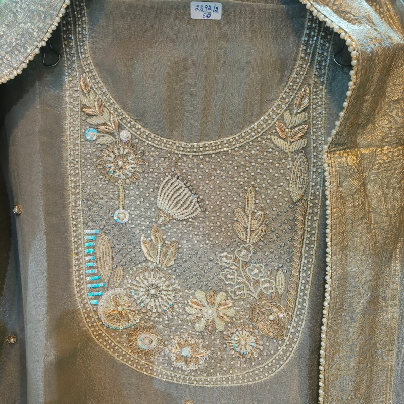 • Product Name Suggestion: Rose Gold Tissue Embroidered Suit Set • Fabric: Glass Tissue • Colour: ..