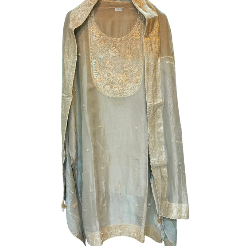 Kurta: Features an intricately embroidered round neckline or yoke with detailed threadwork and minimal embellishments. The body is simple, allowing the fabric's shimmer to stand out.