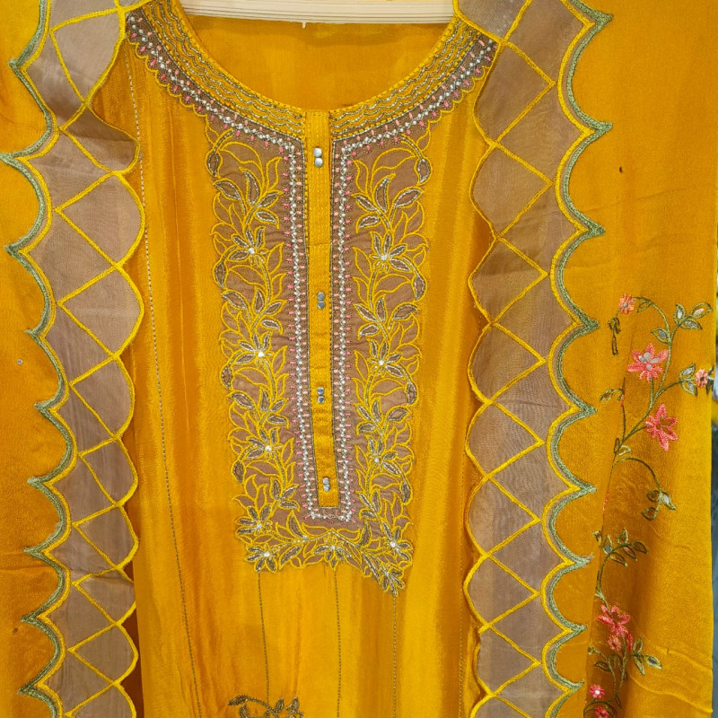 Product Name: Zardosi Marigold Chenon Suit Set Colour Description: Bright Marigold Yellow (A vibr..