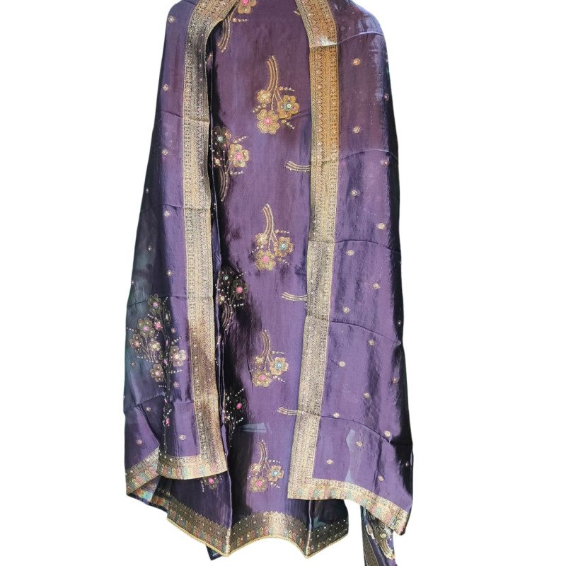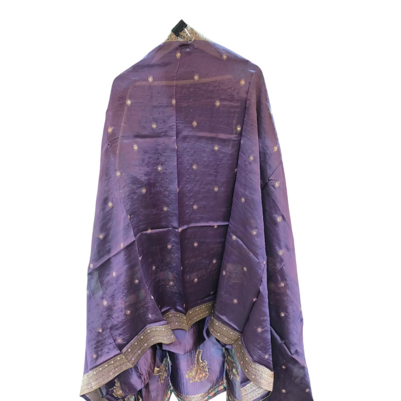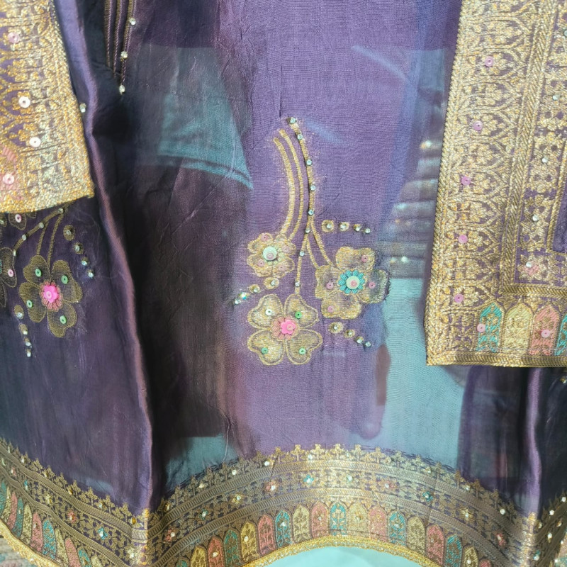 Colour: A deep and vibrant Purple (resembling Royal Purple or Mulberry) with multi-colored floral embroidery and contrast gold zari work.