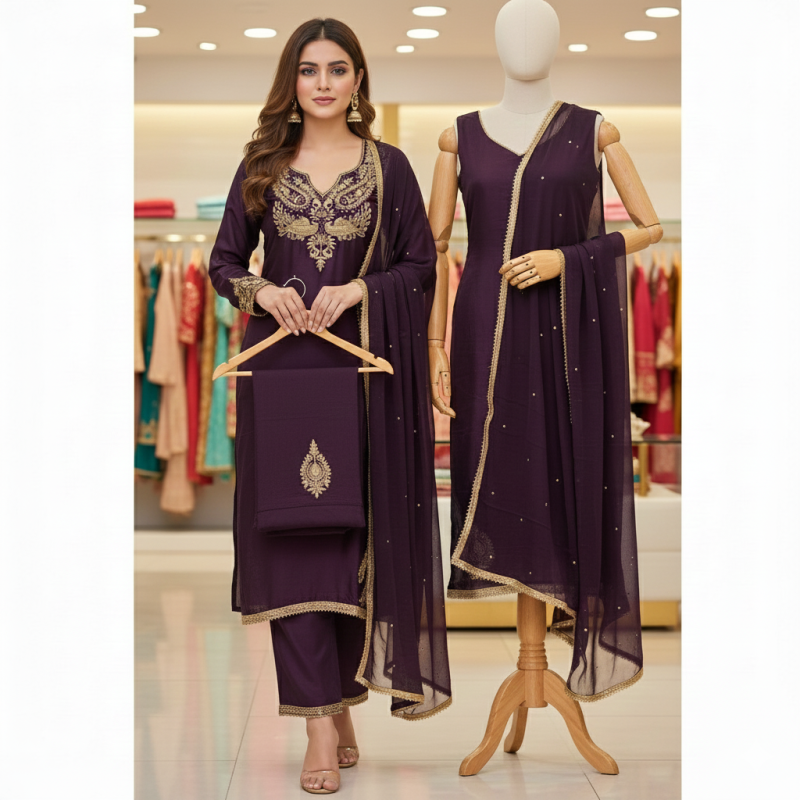 Overall Price: ₹3,100 (Unstitched 3-Piece Suit Set). Fabric (Kurta/Top): Premium quality fab..