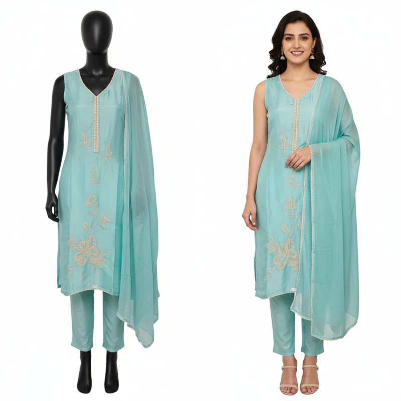 Elegant Aqua Suit with Gold Thread Embroidery and Crepe Bottom (Price ₹2200)