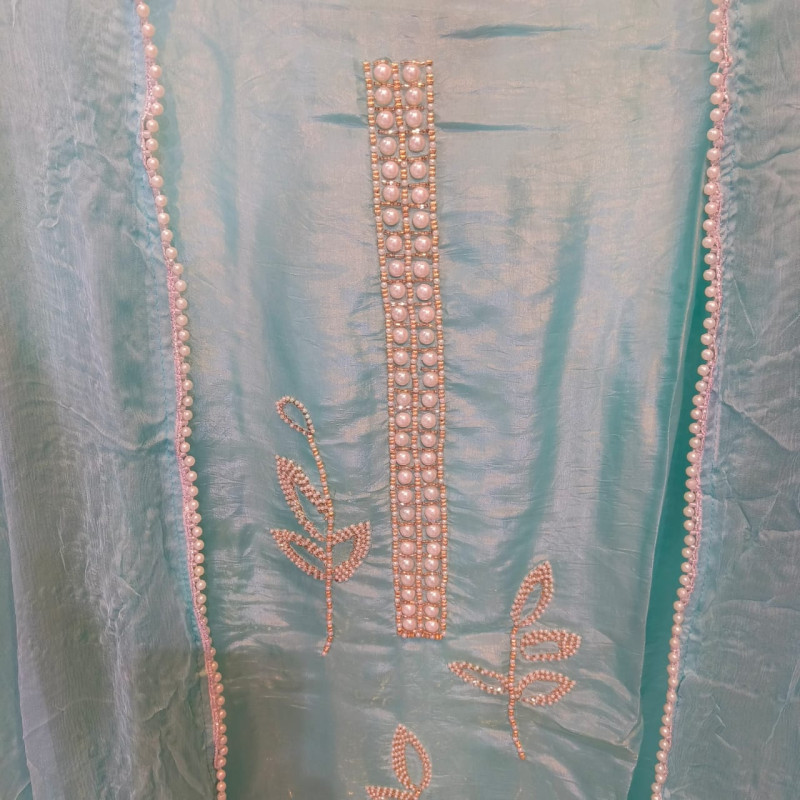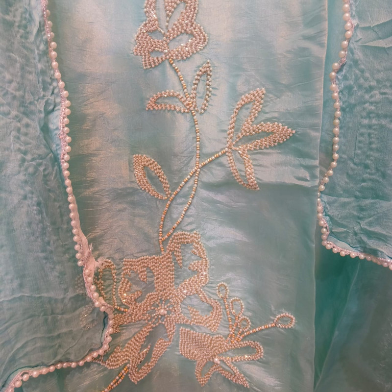 Fabric (Kurta/Top): "Glass" fabric (often refers to a smooth, shiny, lightweight finish, possibly an organza or silk blend with a sheen).