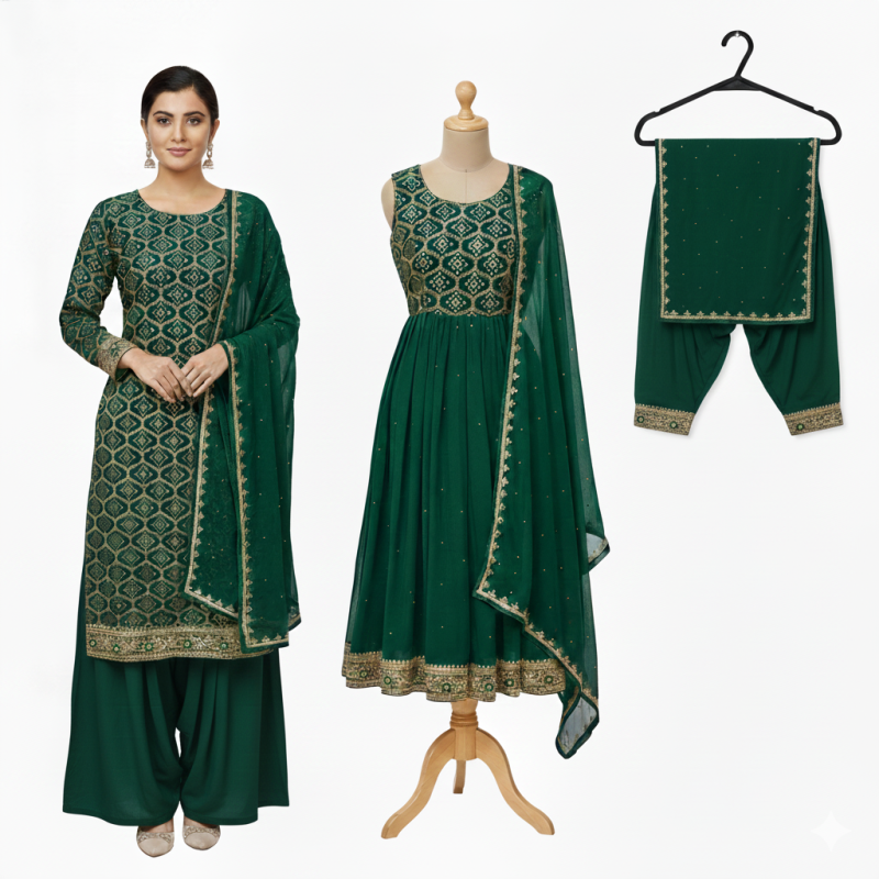 This exquisite suit set features a luxurious Deep Emerald Green color, making it ideal for festive and special occasions.