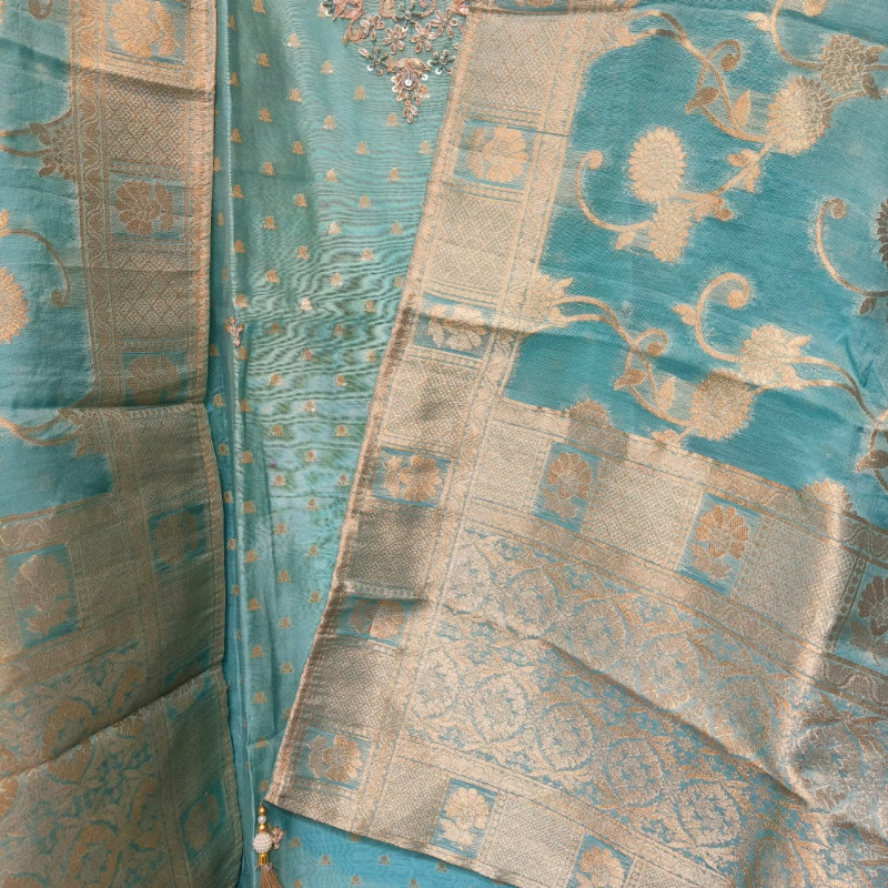 Colour Description: Vibrant Teal Blue (A rich, medium blue with green undertones, chosen for a luxurious look that complements the gold Banarasi work).