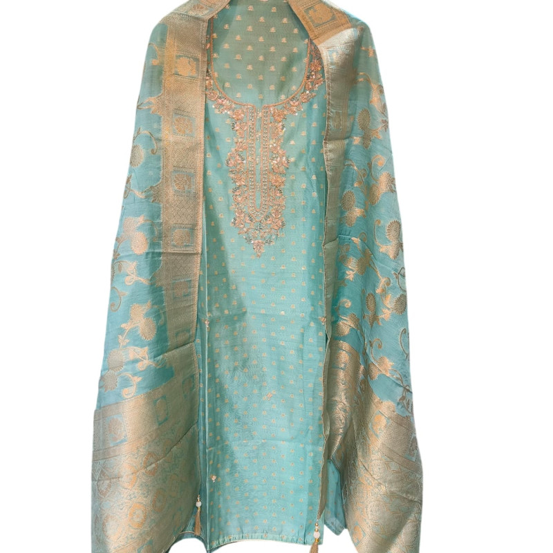 Bottom (Salwar/Pants): Solid Shantoon or Cotton Silk in a matching Teal colour.
