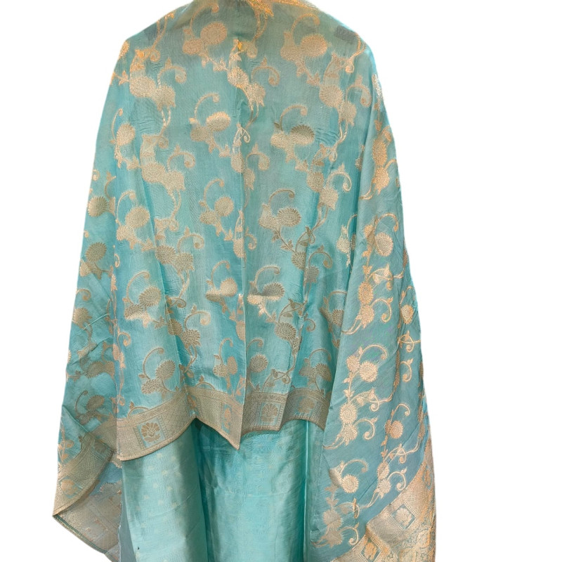 Dupatta: Heavy Banarasi Weaving Work in a rich gold Zari, covering the full expanse of the dupatta with traditional motifs and prominent borders.