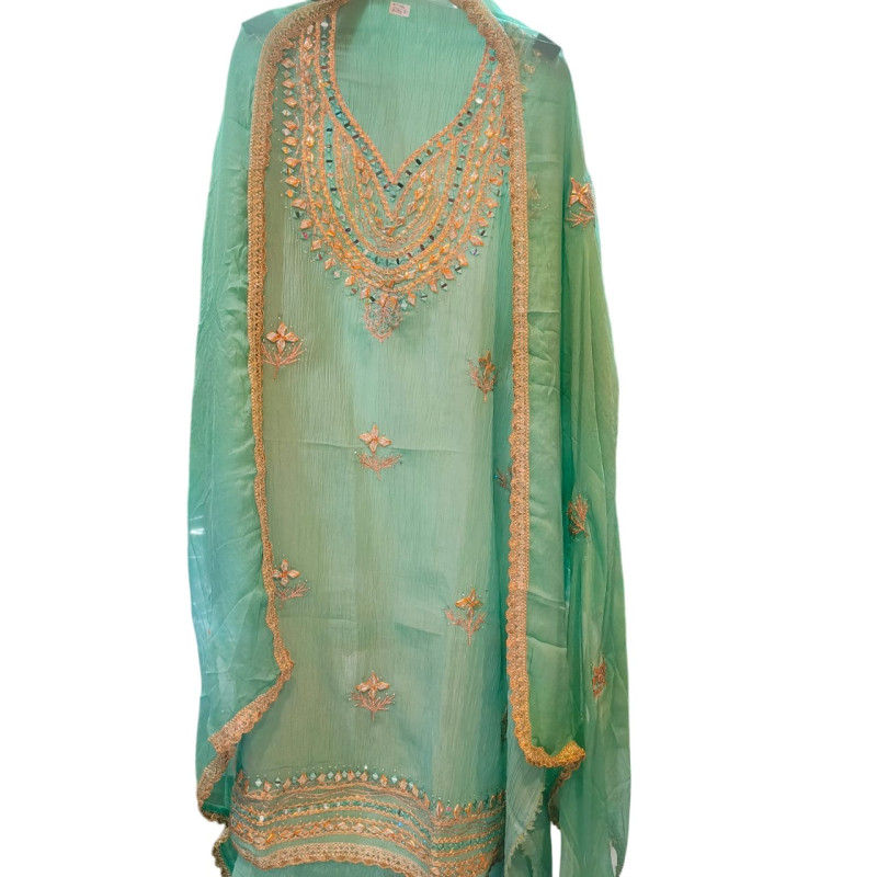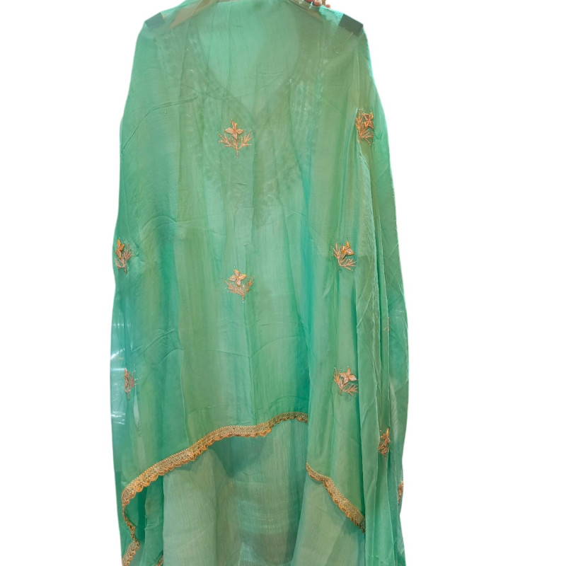 Dupatta Design: Lightweight Chiffon adorned with complementary Gota Patti work along the borders and scattered motifs (bootis) across the body for a unified, festive appearance.