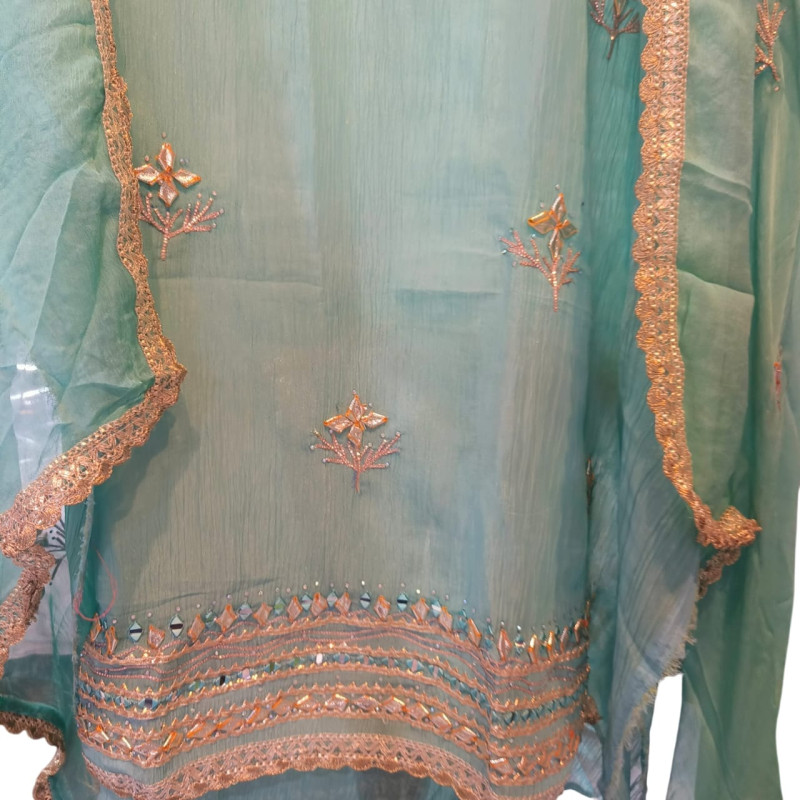 Kamiz Work: Features intricate and traditional Gota Patti work applied heavily around the yoke/neckline of the top.