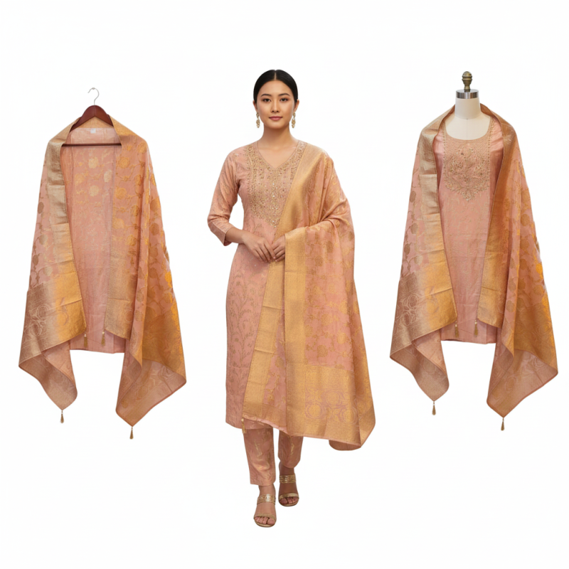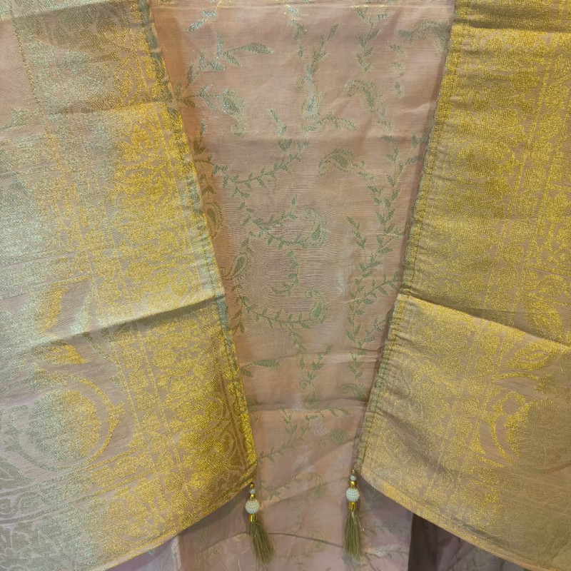 Dupatta: Banarasi Woven Silk/Blend dupatta, featuring heavy, all-over golden zari weaving and a broad border, matching the look of the sample image.