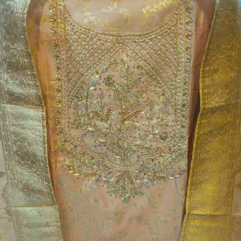 Colour Description: Peach Gold: A rich, warm, and bright shade of light orange-pink, reminiscent of a setting sun, complementing the gold Banarasi and Sitara work.