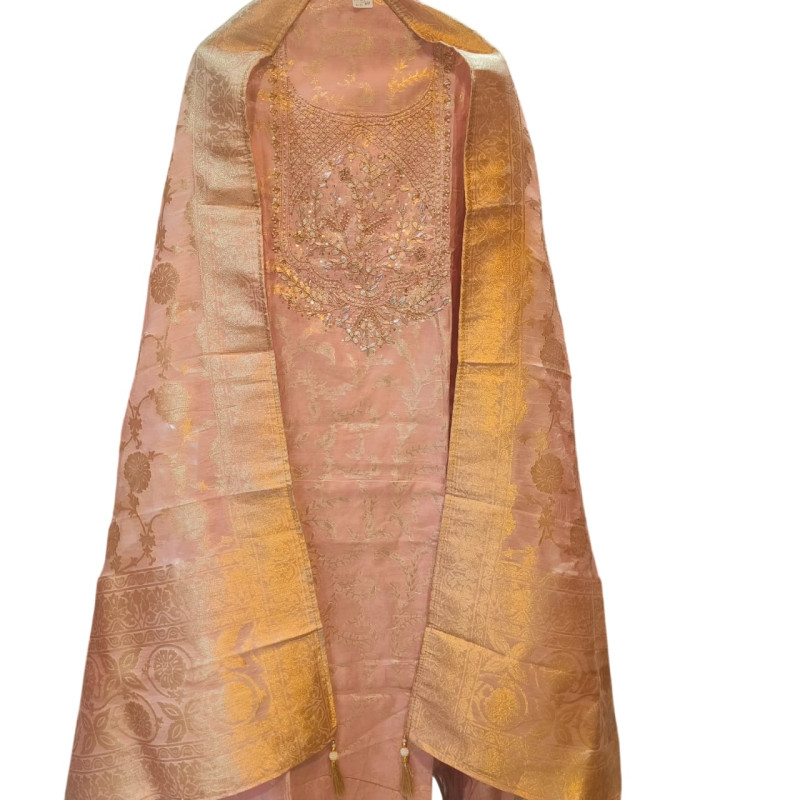 Product Name: Rose Pink Hand-Embroidered Chiffon Suit (Alternative Name: Peach Crape & Chiffo..