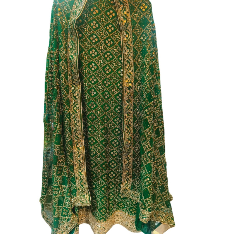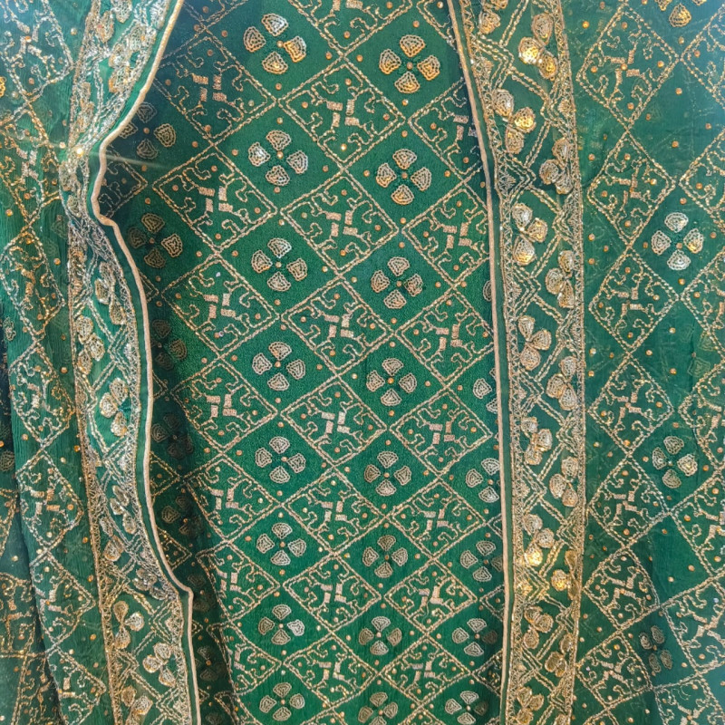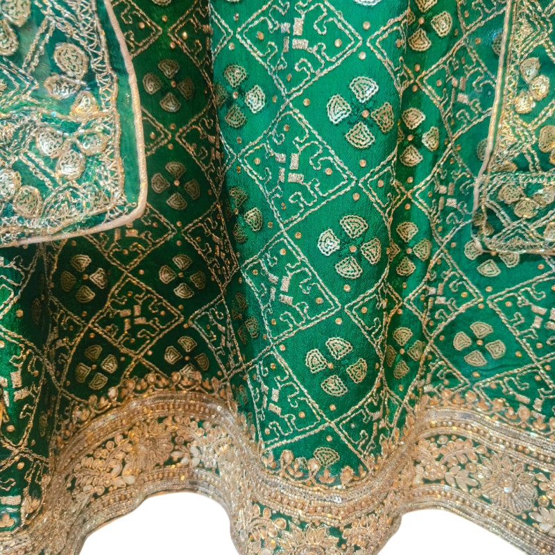 Ghere (bottom border) aur dupatta ke kinaro par heavy embroidered lace border lagaya gaya hai.