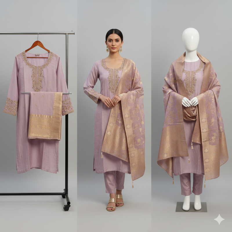 Elegant Shimmer Silk Embroidered Suit Set.