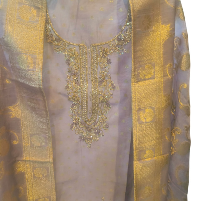 Color: The outfit features a soft, elegant shade of pale lavender (lilac) with shimmering gold embroidery and metallic accents.