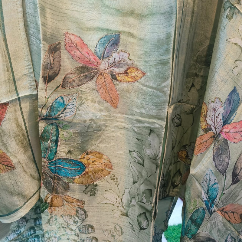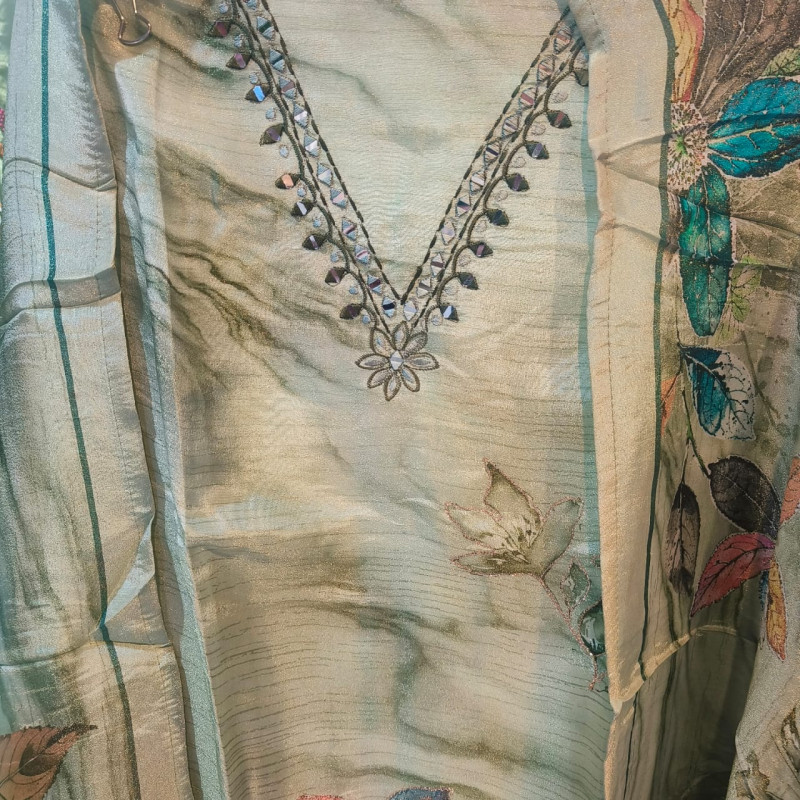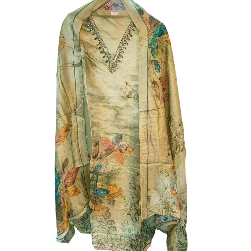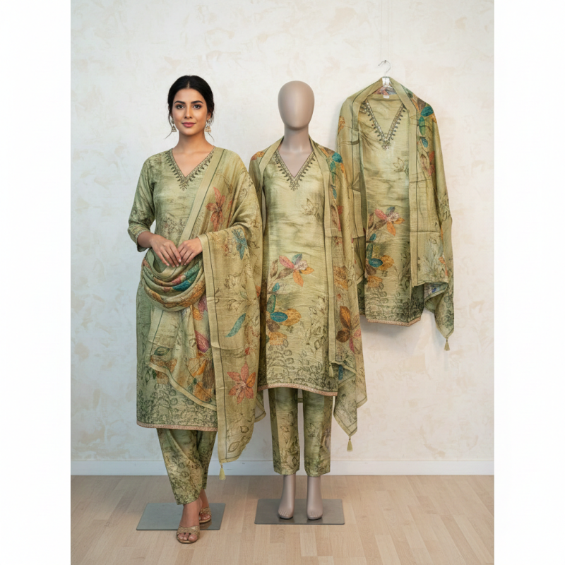 Colour: Yeh suit ek bohot hi shaandaar Sage Green (Halka Olive) shade mein hai, jis par multi-color floral prints diye gaye hain.