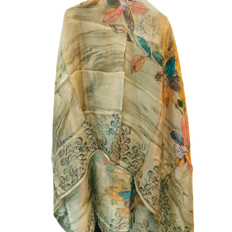 Fabric: The outfit appears to be made of Chinon Silk or a similar soft, flowing silk blend like Tuss..