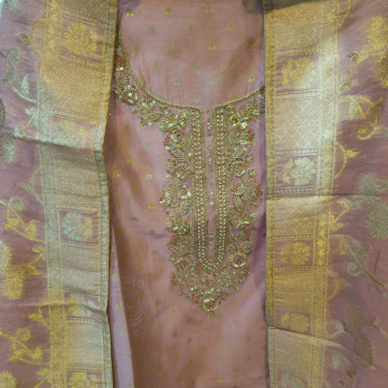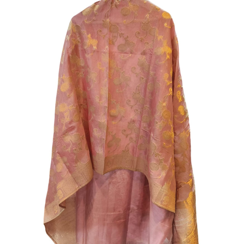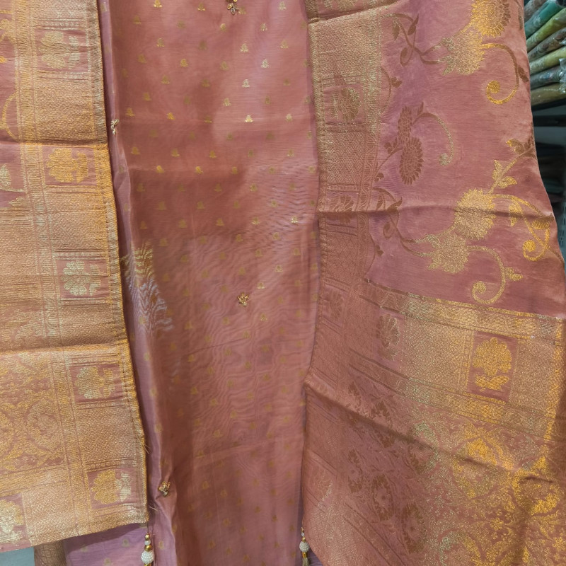 Dupatta: The highlight is the Banarsi Chanderi dupatta, which features rich golden weaving on the borders with traditional floral and leaf patterns. It is finished with elegant tassels at the corners.
