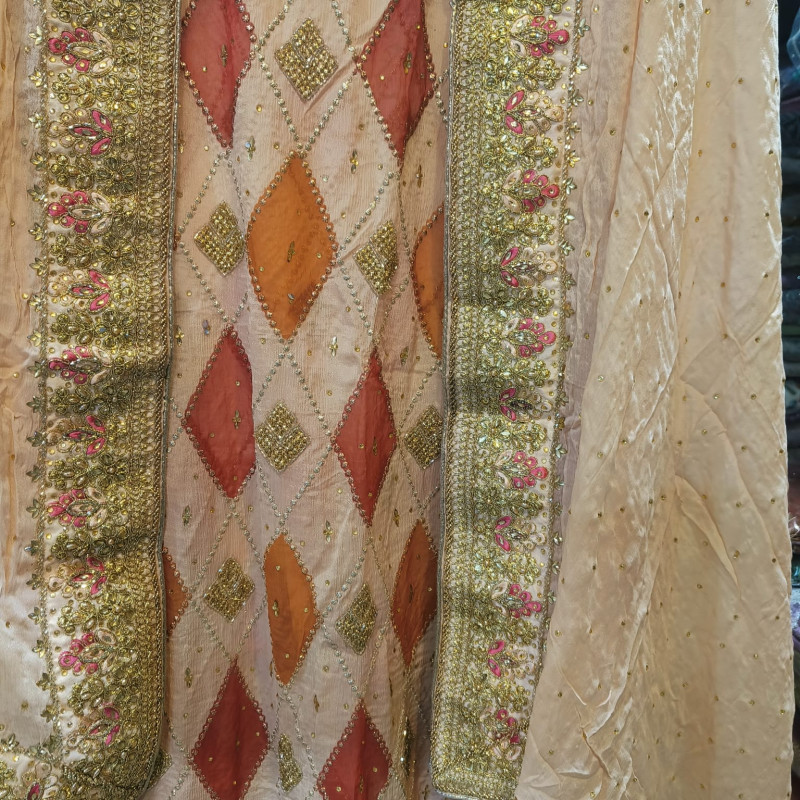 Fabric (Kamiz/Shirt): Premium Chinon fabric featuring full heavy work on the front, back, and arms for a complete bridal look.