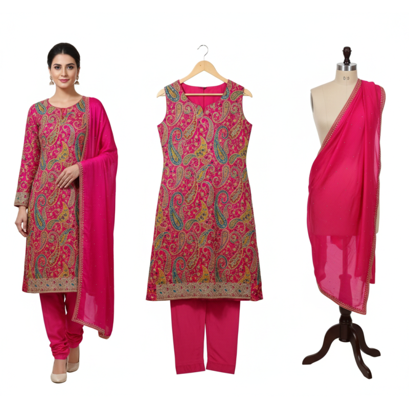 Type: A complete stitched traditional outfit that includes kameez (top), salwar (bottom), and often ..