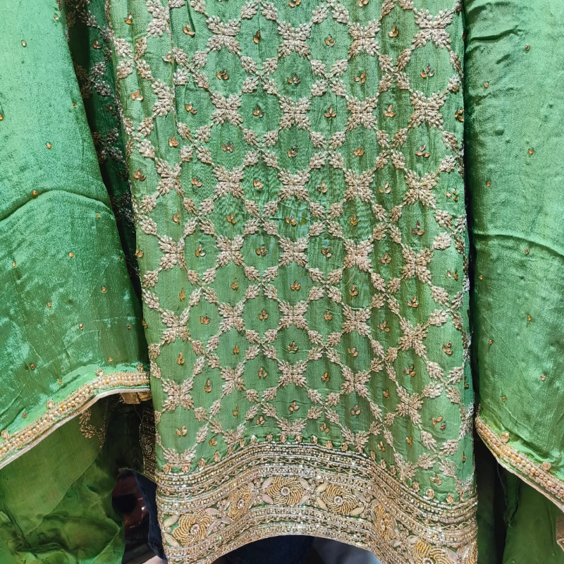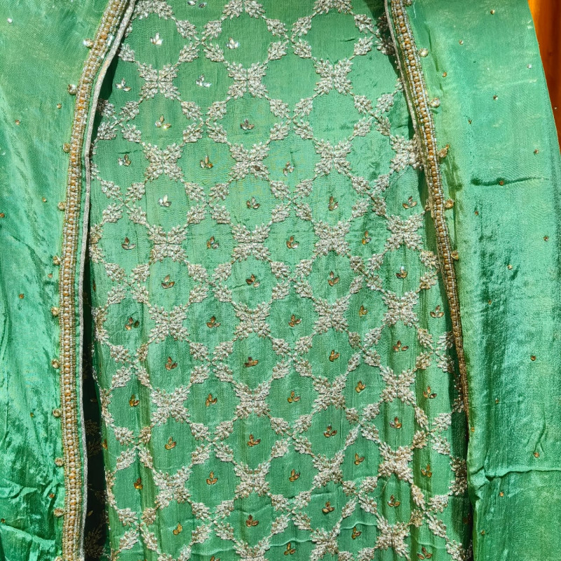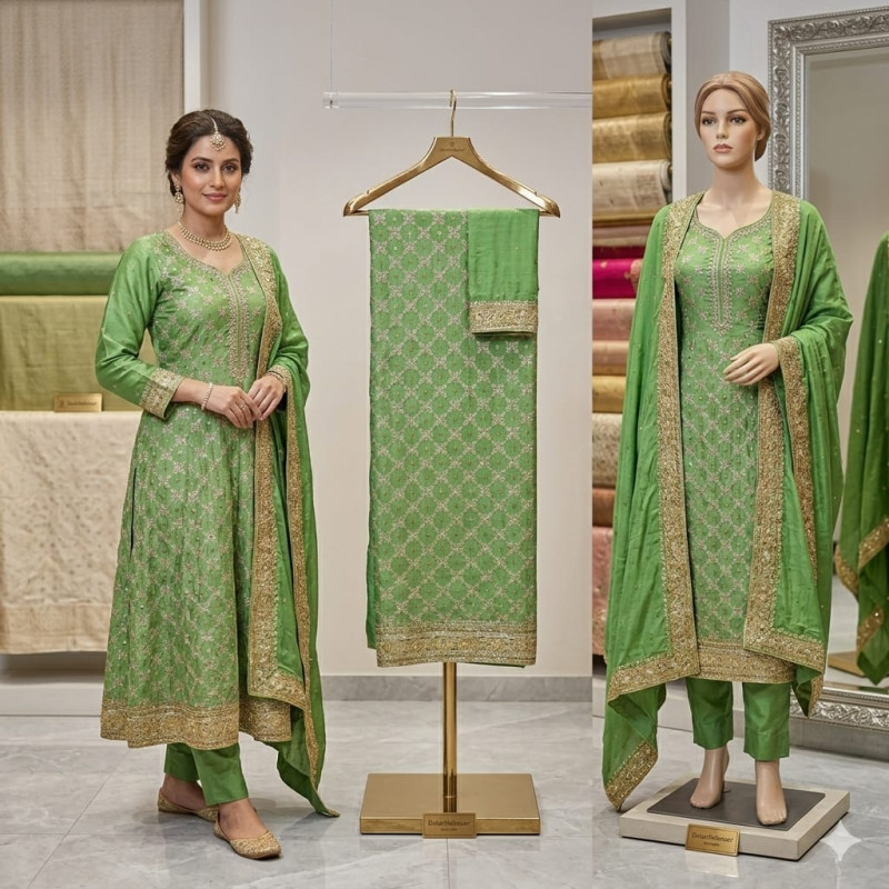 Tags: #VeeranFashions, #PistaGlaze, #ChinonSuit, #PistaGreen, #HeavyDaamanWork, #UnstitchedSuit, #ChiffonDupatta, #FestiveWear2026, #AffordableLuxury, #CrapeBottom, #BoutiqueCollection, #DelhiFashion, #TraditionalEdition, #EthnicVibe, #DesignerSuits