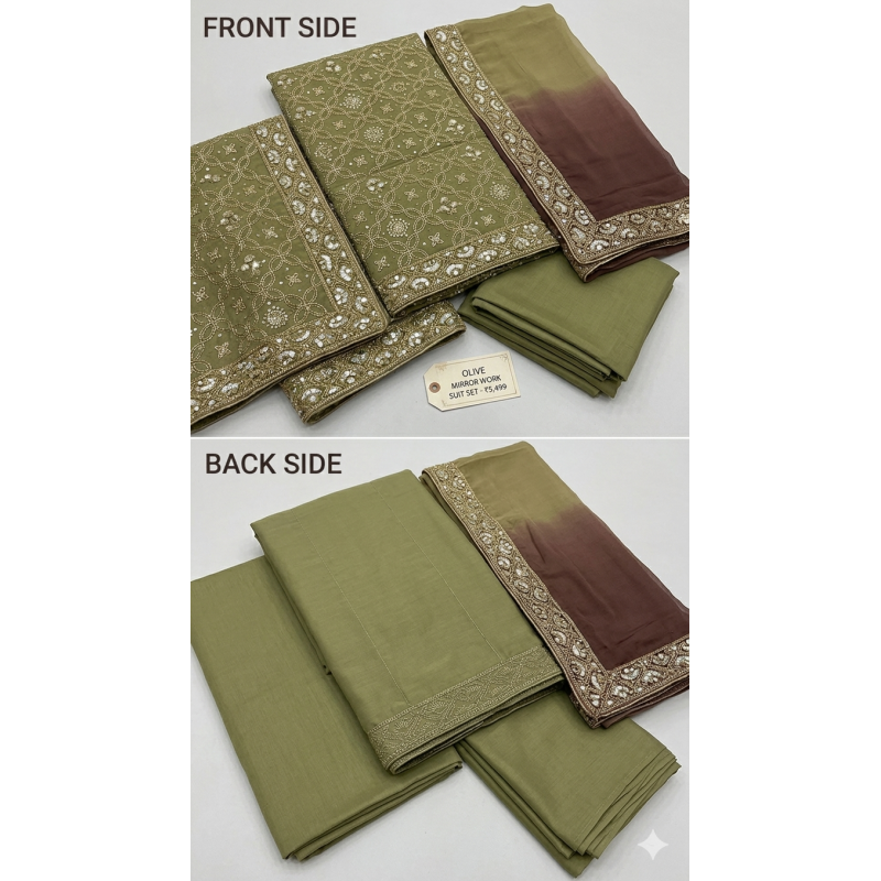 Veeran Fashions pesh karte hain Chandni Chowk ka sabse trending design. Is Sage Green Chinon Silk Suit ka fabric behad soft aur premium hai, jo aapko royal feel deta hai. Kamiz par intricate mirror work aur thread embroidery di gayi hai. Iska sabse bada highlight iska Lavender Contrast Dupatta hai, jo green base ke saath ek unique aur stylish combination banata hai. Ye Unstitched Fabric set wedding functions aur festive parties ke liye best hai.