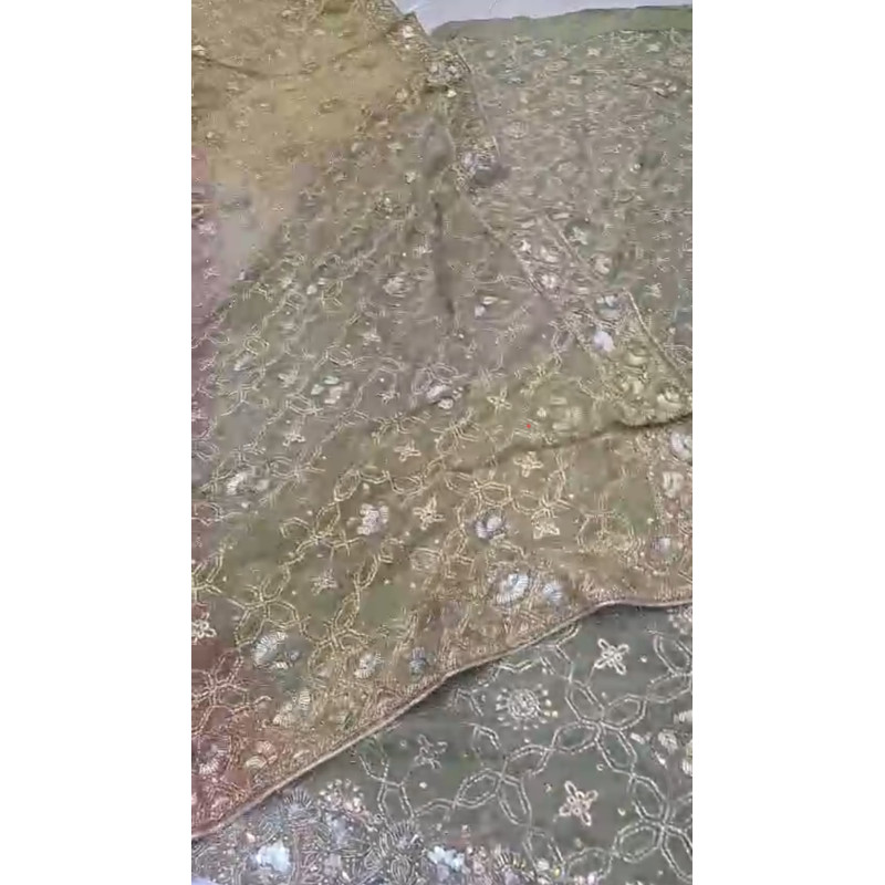 Color: Deep Sage Green kamiz with a Lavender & Green dual-tone contrast dupatta