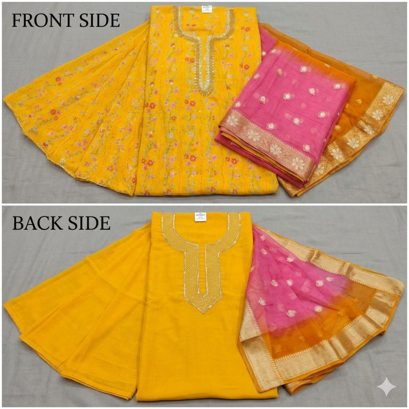The Glow of Tradition: Elevate your ethnic style with this exquisite set from Veeran Fashions. Sourced from the heart of Chandni Chowk, this unstitched fabric set combines the soft drape of Georgette with the ethereal structure of an Organza dupatta. The vibrant contrast of yellow and pink, paired with a high-quality Crepe bottom, makes it a must-have for your festive wardrobe.
