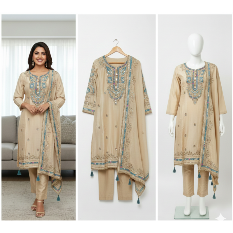 The bottom is plain silk or satin in matching beige tone, designed to balance the heavy work on the top. It could be styled as a straight pant or churidar depending on preference.