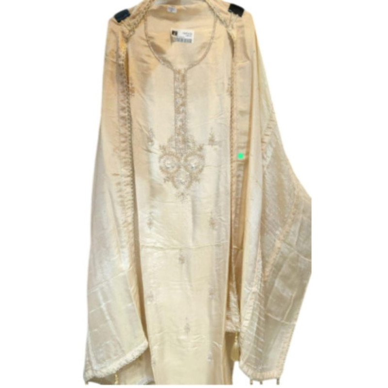 The bottom is a plain silk or satin fabric in the same gold-beige tone, designed to complement the ornate kurta. It can be tailored as straight pants, churidar, or palazzo, depending on style preference.